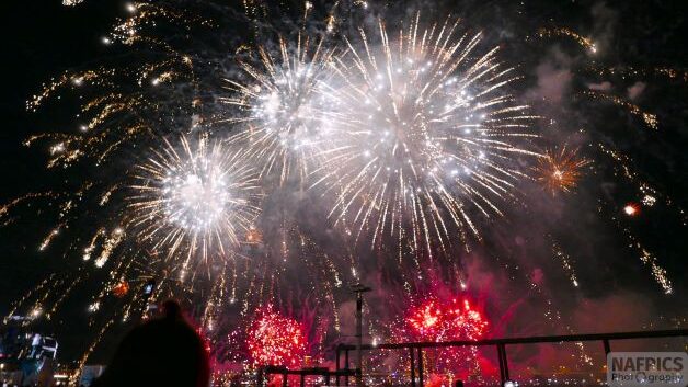 等了大約一小時,會場的燈光都熄滅,煙火在淡水河的夜空中齊齊升空, 場面既帥氣又壯觀。這場持續約5分鐘的煙火秀結束後,大部分的觀眾就陸續離開了。我聽到遠處傳來音樂,所以決定去美食區逛逛再去看演唱會。